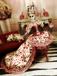 Made expressly for the 2020 Roma Fashion Doll Convention Charity Auction - Studio 54 Rollergirl In addition to Facial Make-Over, Lined Coat, This Delegate Features: Made expressly for the Rome Fashion Doll Convention and their theme of "Disco 70's" NiniMomo presents their Studio 54 Rollergirl. She wears a bodysuit covered from top to bottom in hand-sewn small gold sequins. At waist, a braided sash belt in silk chiffons feature rich, hand-beaded fringe at either end in cubic zirconias, bugle beads, seed beads and golden charms. Accompanying her bodysuit is a lush, faux fur, rainbow colored coat lined in silk lurex. She wears her 70's disco "cloche" wig painstakingly comprised of dozens upon dozens of hand-beaded fringe in seed beads and bugle beads. Her retro rollerskates have been custom painted and decorated in Swarovski crystal rhinestones. Three tiered gold necklaces, rhinestone and Swarovski earrings and bangle bracelets. Purple shades edged in Swarovski crystal rhinestones. Gold disco ball purse adorned with Swarovski crystal rhinestones. Eye Color: Turquoise / Lip Color: Frosted Pink Doll Formerly: "Spa Getaway Silkstone"